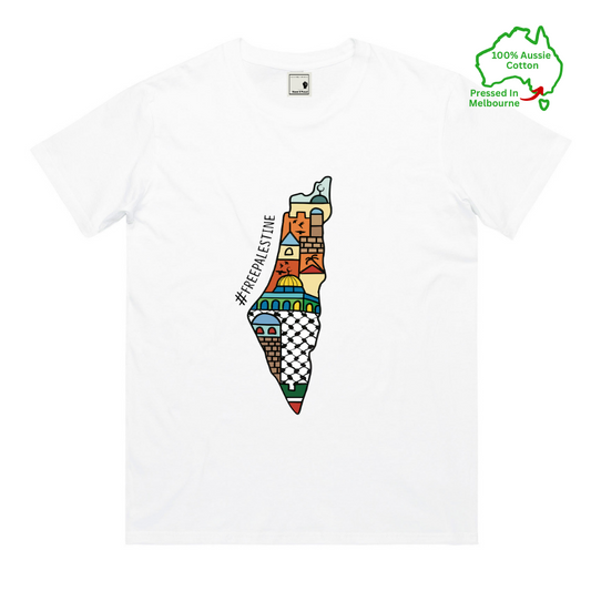 Featuring a striking print of the "Free Palestine" tag alongside a map of Palestine, these shirts let you wear your support proudly